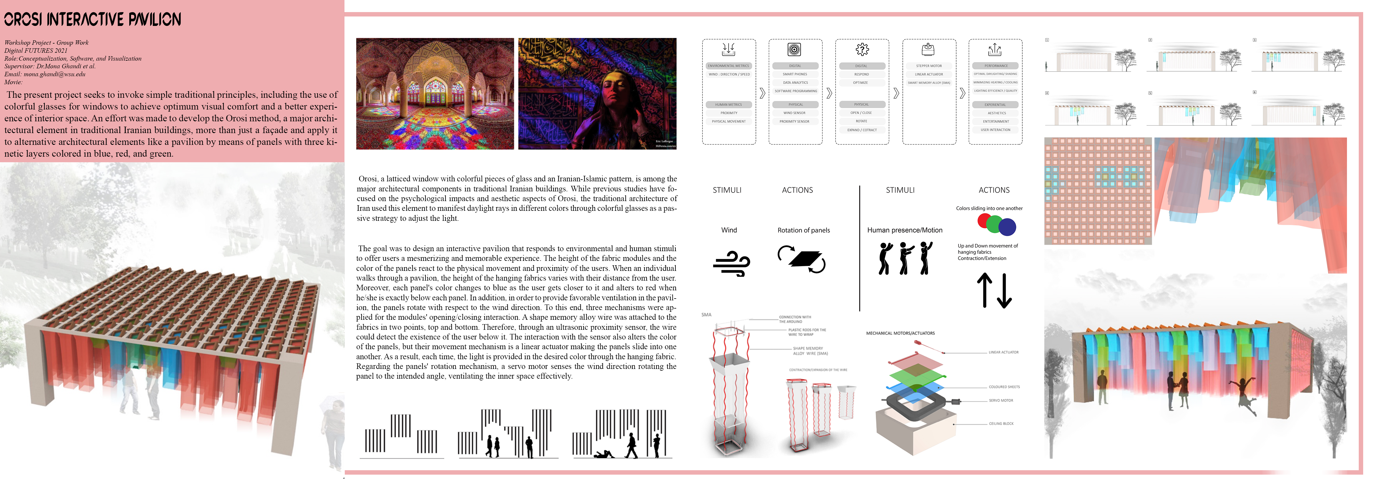 The pavilion responds to environmental stimuli (wind direction/speed) and human stimuli (presence, proximity, movement). Panels rotate for ventilation alignment, while fabrics move up/down and color layers slide to shift the perceived atmosphere—creating a memorable, responsive space rather than a static façade.