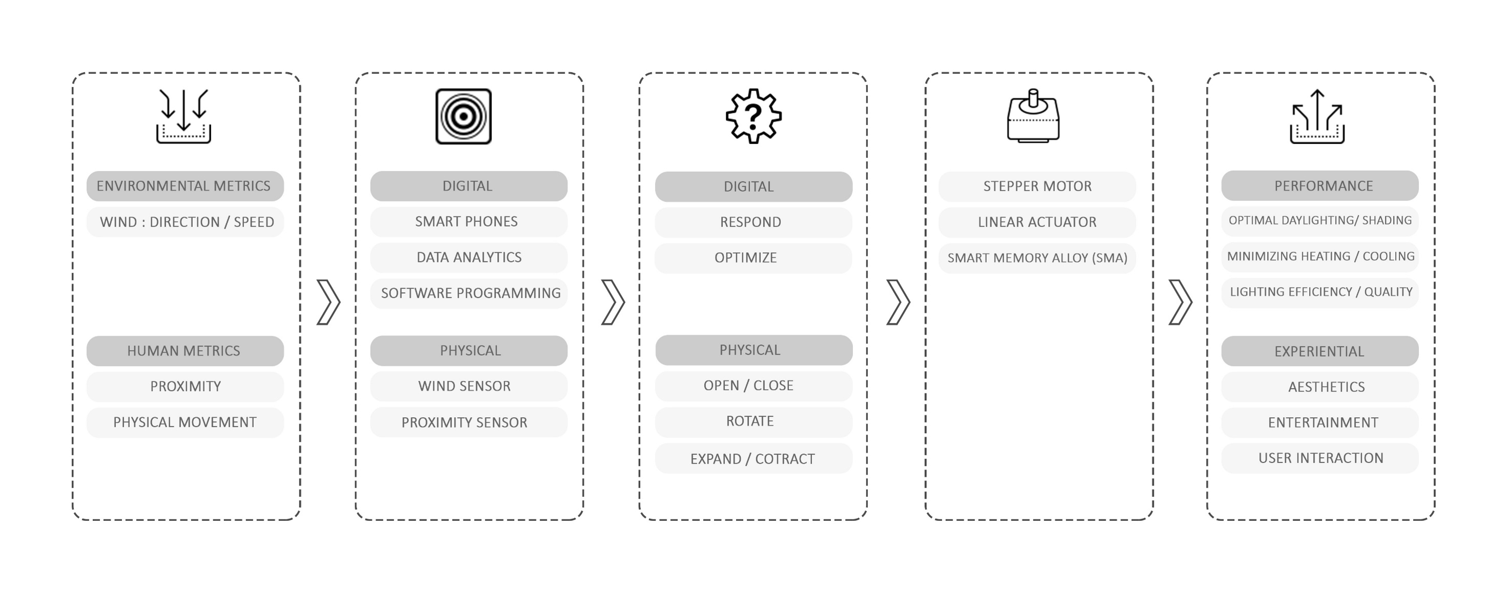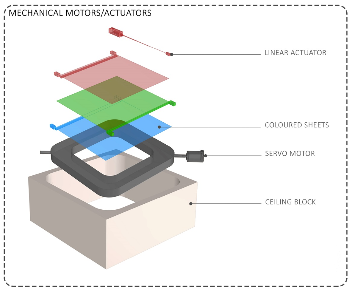 Pipeline: metrics → sensors/software → actuators → performance + experiential outcomes.Exploded mechanism: layered sheets (RGB) slide via linear actuation; rotation supports ventilation behavior.SMA concept: contraction/extension at two attachment points moves hanging fabrics up/down.