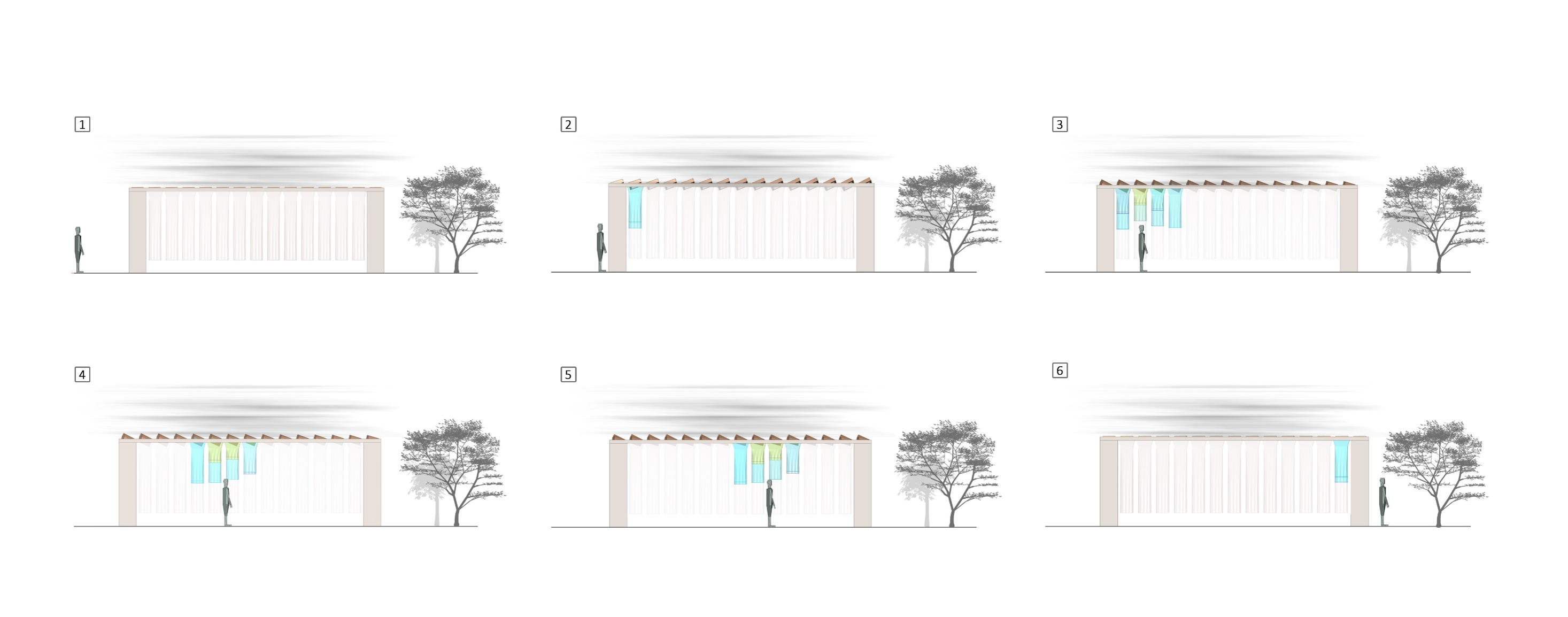 Storyboard silhouettes: the pavilion reacts across movement, gathering, and pause moments.Elevation sequence: visible changes in fabric height and color distribution as users move.