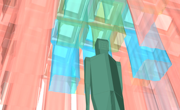The height of the fabric modules and the perceived color of the panels react to physical movement and proximity.