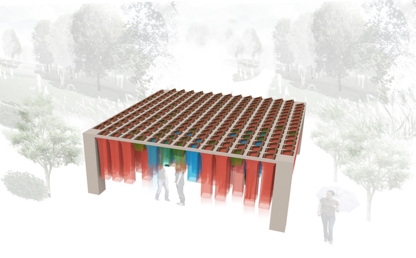 As a person walks through the pavilion, the fabrics vary in height with distance, and the color logic shifts—e.g., a panel may transition toward blue as a user approaches and alter when the user is directly beneath it.