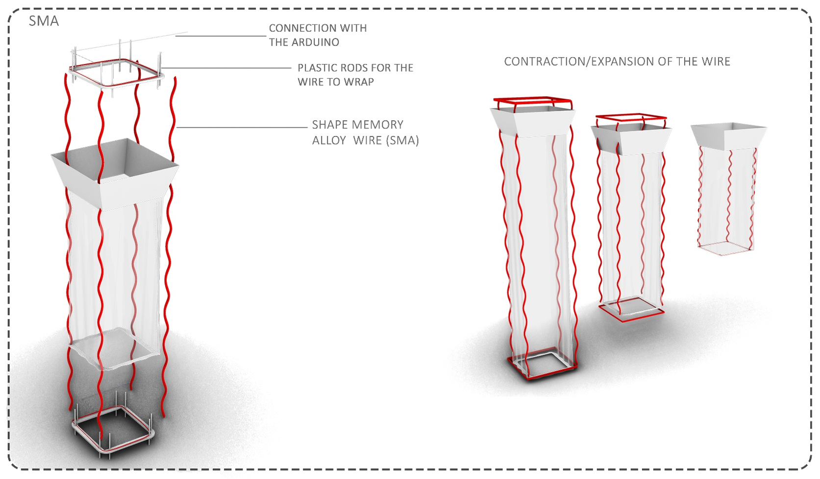 Shape Memory Alloy (SMA): contracts/extends to raise/lower fabrics