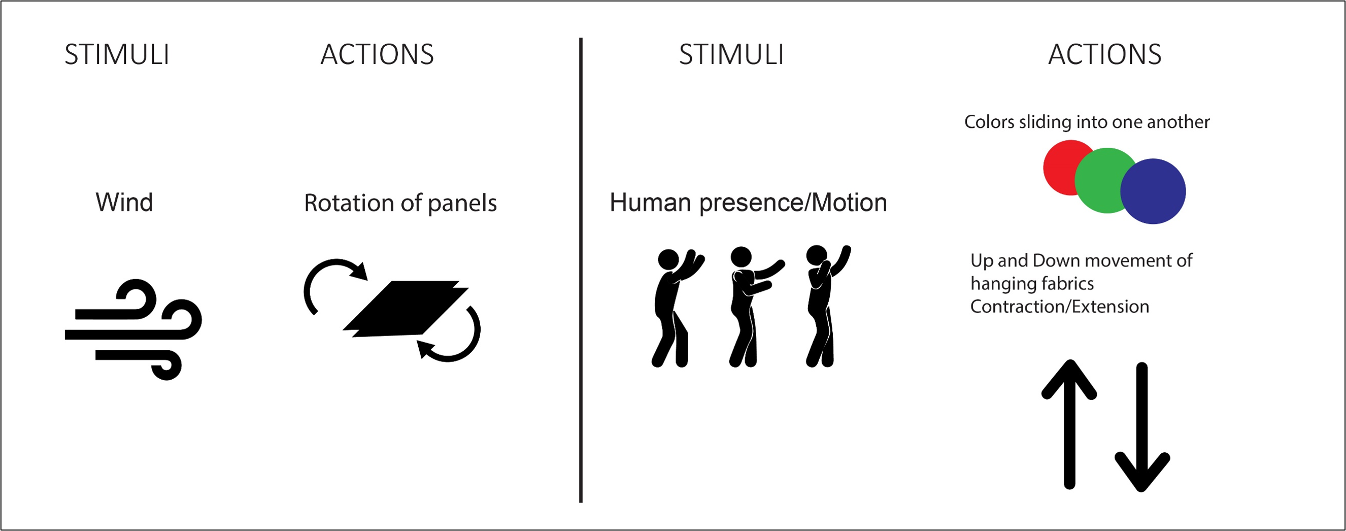 Stimuli → actions: wind drives panel rotation; human presence/motion drives color transitions and fabric movement.