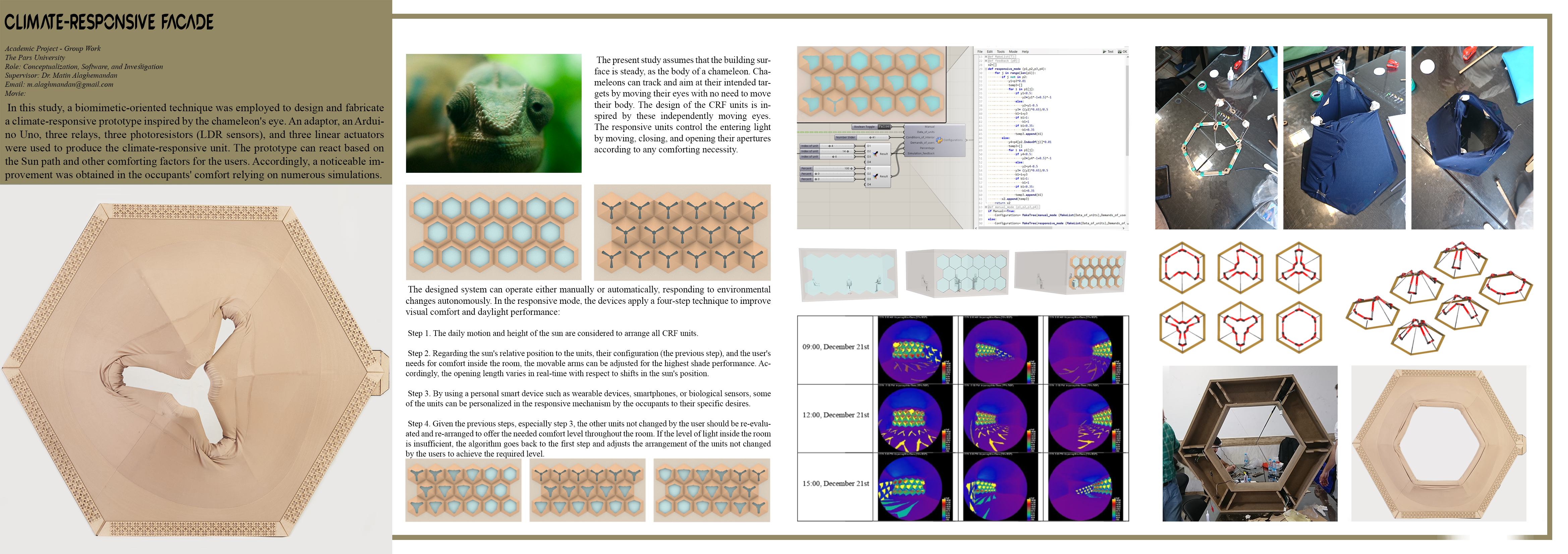 Climate‑Responsive Façade (CRF) is a biomimetic, textile-based kinetic envelope prototype designed to improve visual comfort (daylight quality + glare control) in hot and arid climates. Inspired by how chameleons move their eyes independently, each façade module can adjust its aperture and orientation in real time, enabling localized shading responses for different zones behind the same façade.