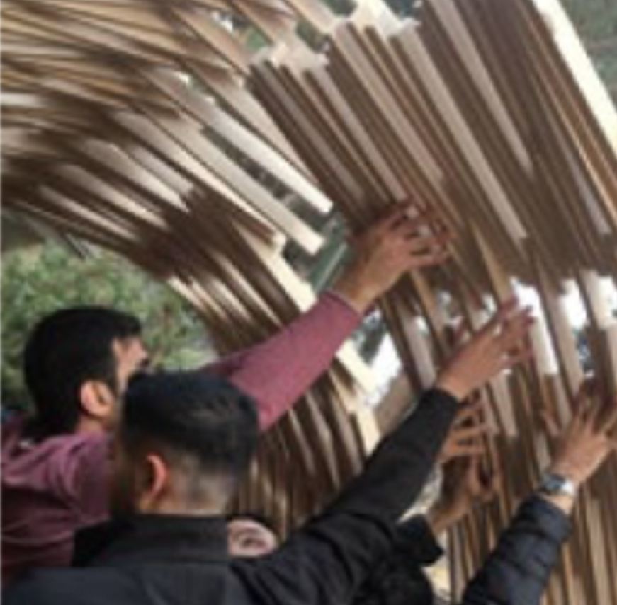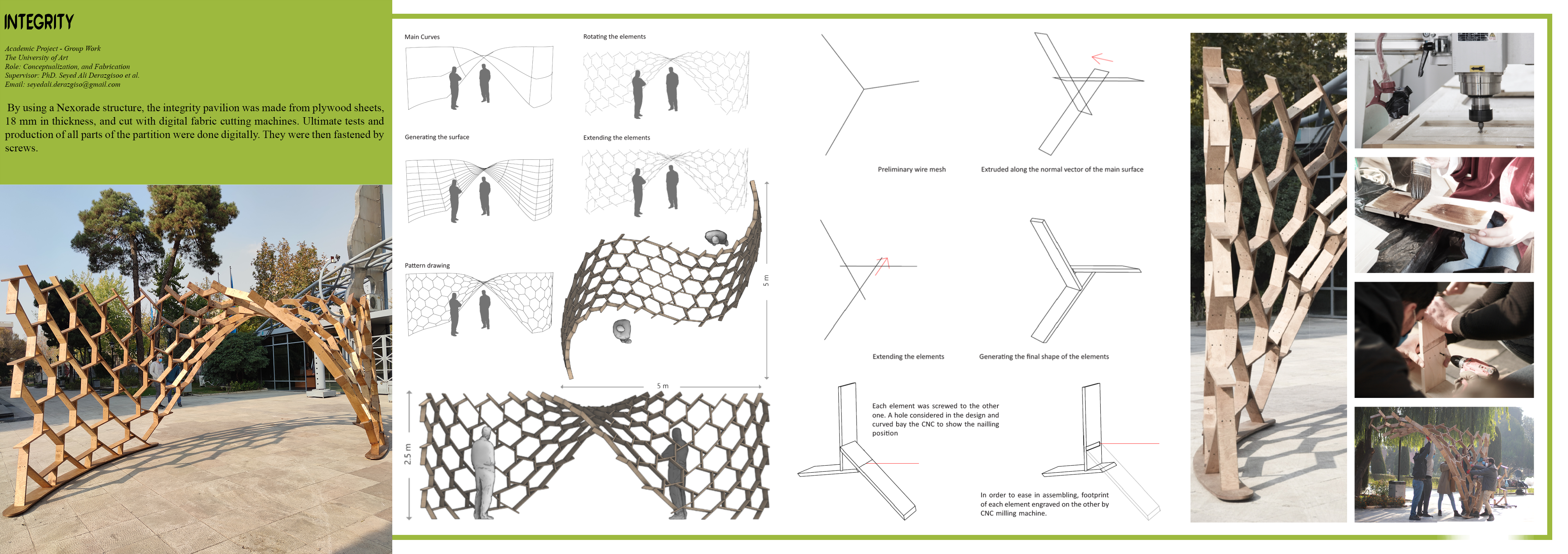 INTEGRITY is a full-scale plywood pavilion developed as a digital fabrication project using a Nexorade structural logic. The project was designed and tested digitally, produced from 18 mm plywood sheets using CNC cutting, and assembled on site using screwed connections (no adhesives).