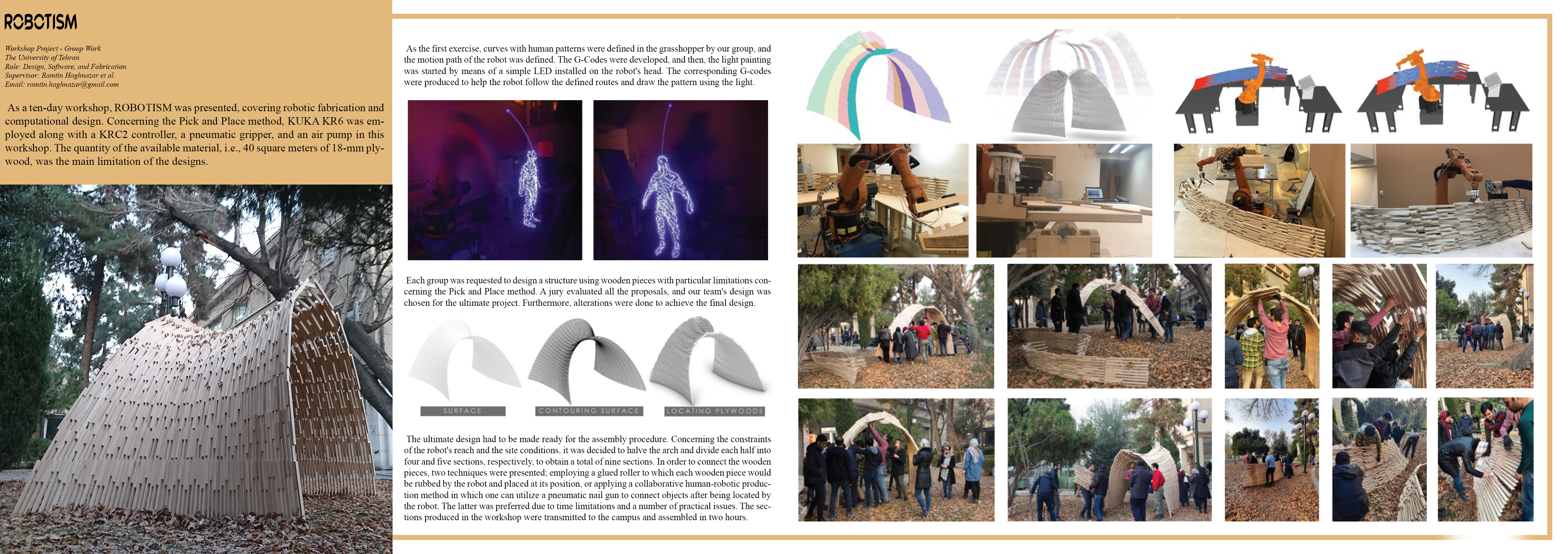 ROBOTISM is a 10-day workshop project in robotic fabrication and computational design. Working in teams, we learned the fundamentals of robot programming and toolpath thinking, then applied them in two tracks: (1) light painting using robot-generated motion paths, and (2) pick-and-place fabrication using a KUKA KR6 equipped with a pneumatic gripper. The final outcome was a full-scale plywood pavilion assembled from robot-placed components and completed with a collaborative human–robot fastening workflow.