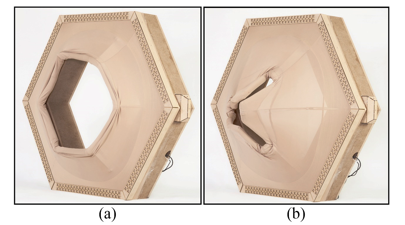 Stretch textiles enable richer motion and lighter mechanisms compared to rigid-panel systems—well-suited for responsive envelope research.