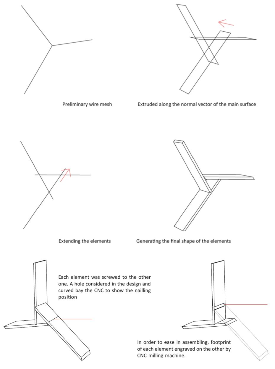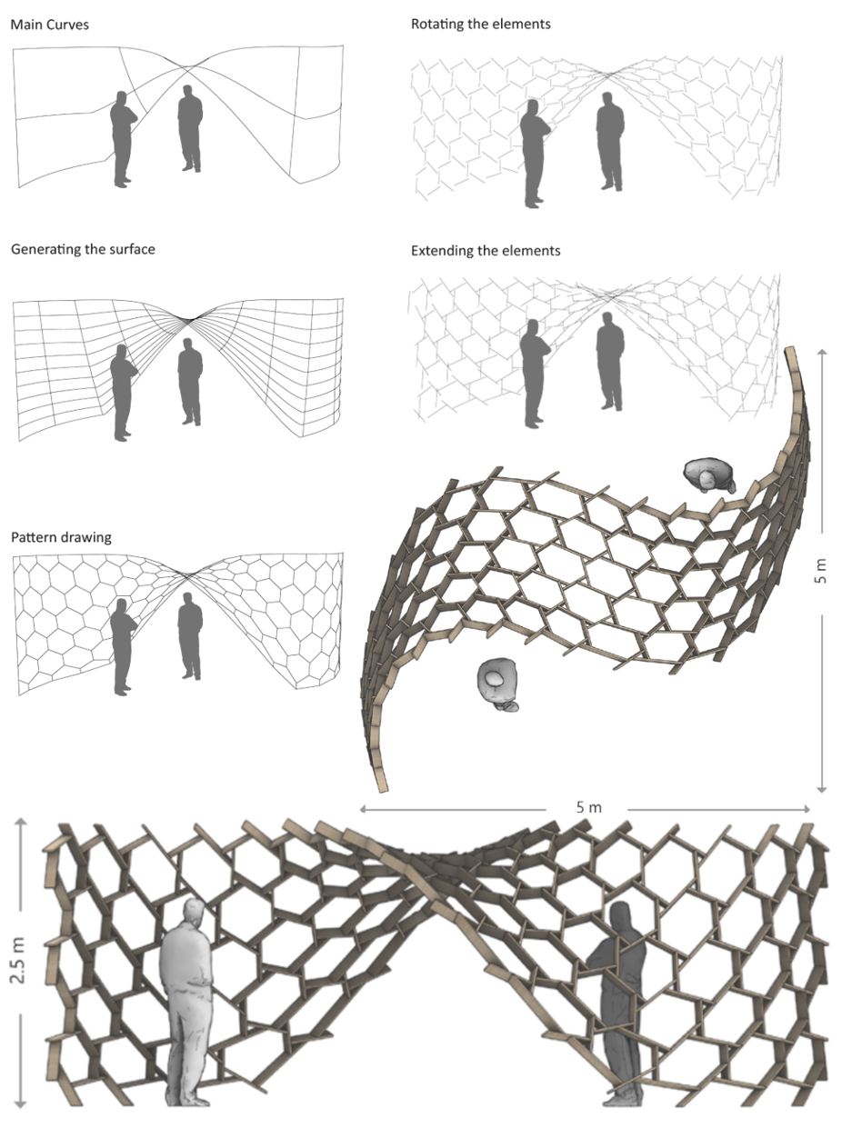 The digital pipeline starts with defining main curves and a guiding surface, then generating a lattice pattern that is adjusted by rotating and extending elements to achieve structural continuity. Element geometry and connection details are finalized to support straightforward assembly and accurate positioning during fabrication.