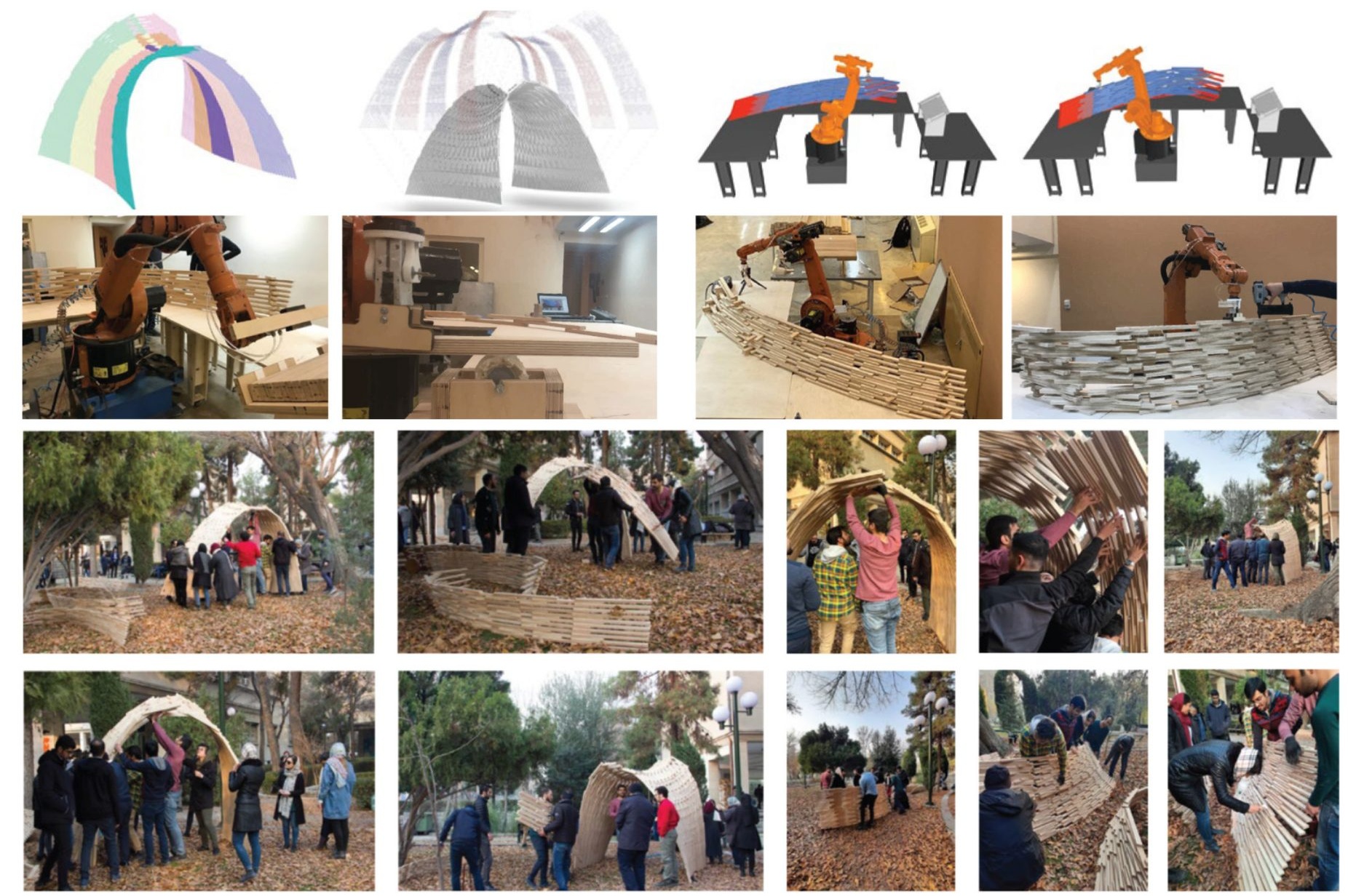Montage showing simulation, robotic fabrication, and on-site assembly